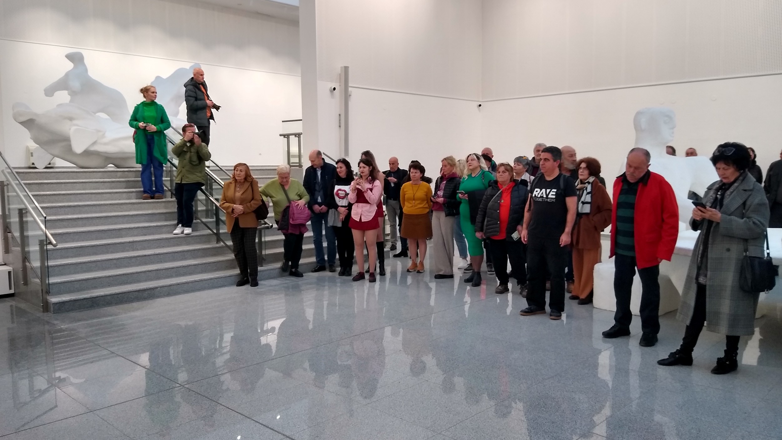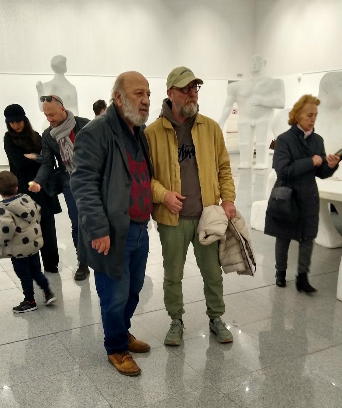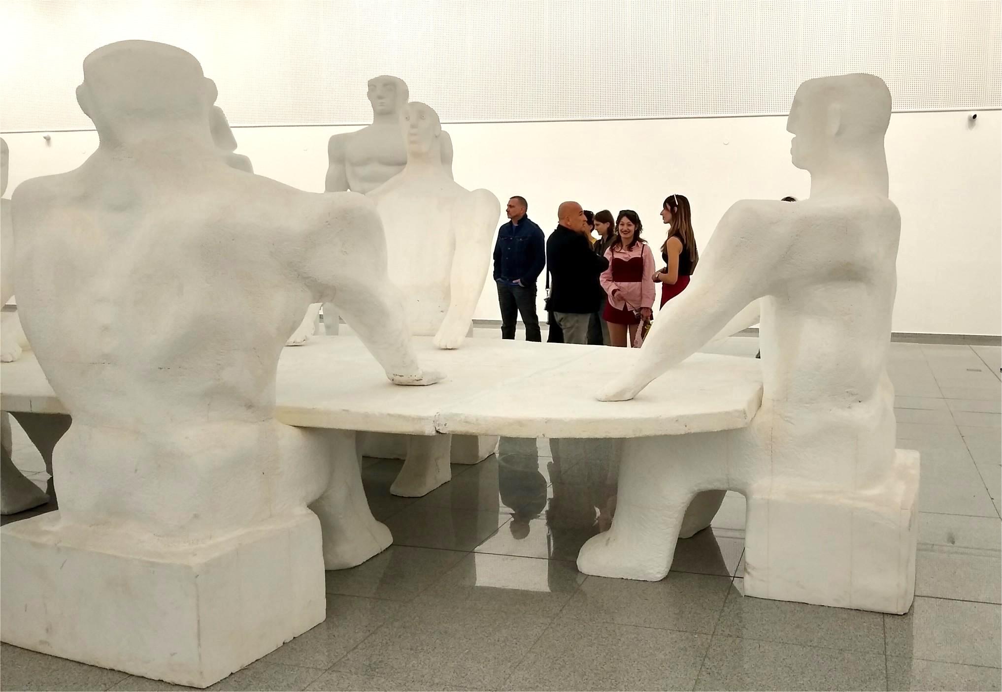 огромните си стилизирани фигурални композиции. Сред публиката на