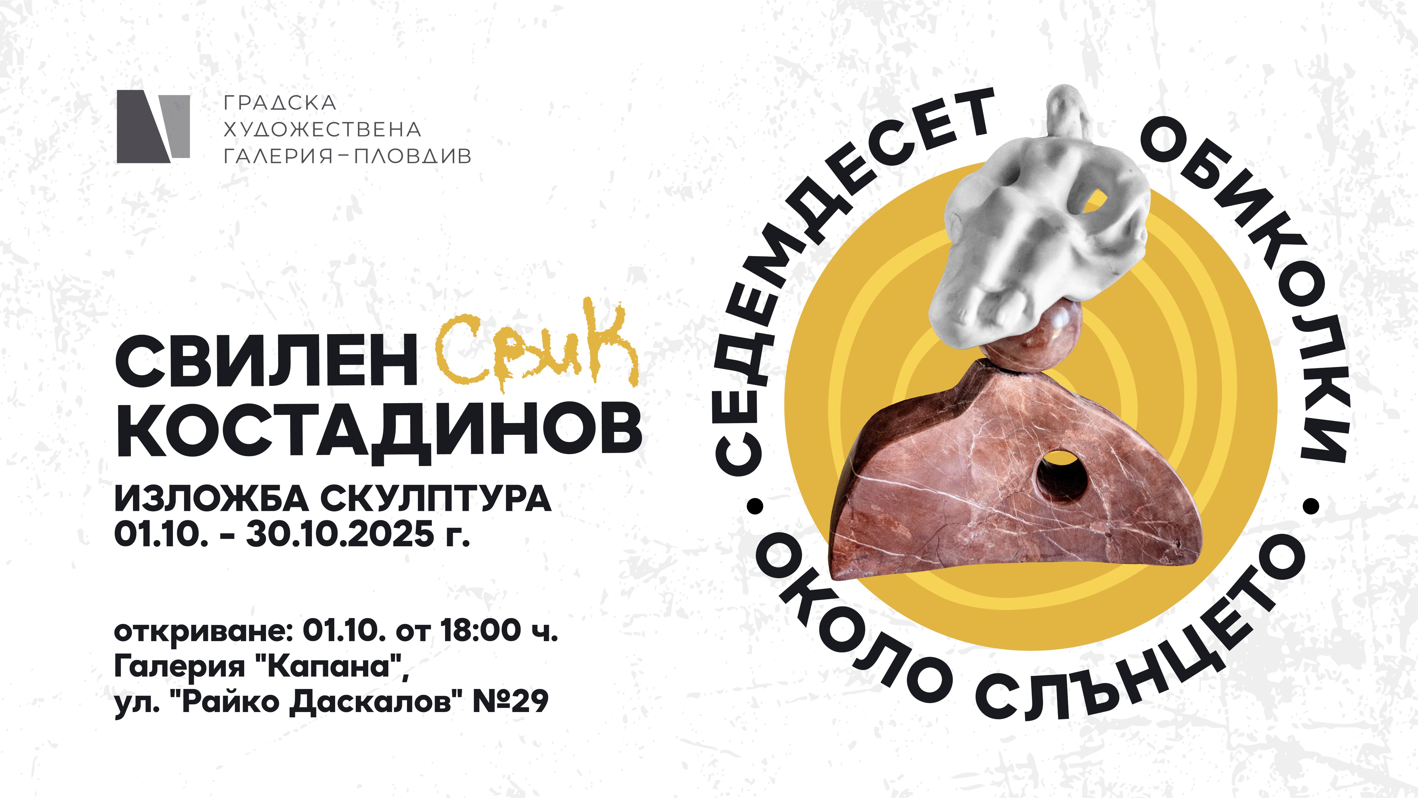По повод своята седемдесета годишнина доц. Свилен Костадинов представя изложбата си „Седемдесет обиколки около слънцето“ – скулптури от мрамор и гранит, обобщение на неговия богат творчески път и дългогодишни търсения в скулптурата.